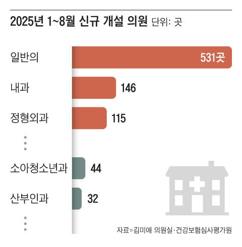 According to an analysis conducted by Rep. Kim Mi-ae from the People Power Party and the Health and Welfare Committee of the National Assembly, based on data from the Health Insurance Review & Assessment Service, general practitioners, internal medicine, and orthopedic surgery have consistently ranked at the top among newly established clinics from 2019 to January-August 2025. For the first eight months of this year, the numbers were 531 general practitioner clinics, followed by 146 internal medicine clinics and 115 orthopedic surgery clinics.