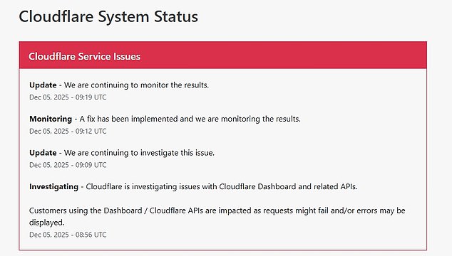 This is the second outage in nearly a month for Cloudflare, which powers internet requests for millions of websites. In a service update just after 9am GMT on Friday, Cloudflare stated that it was "investigating the issue." A few minutes later, it added, "A fix has been implemented and we are monitoring the results."