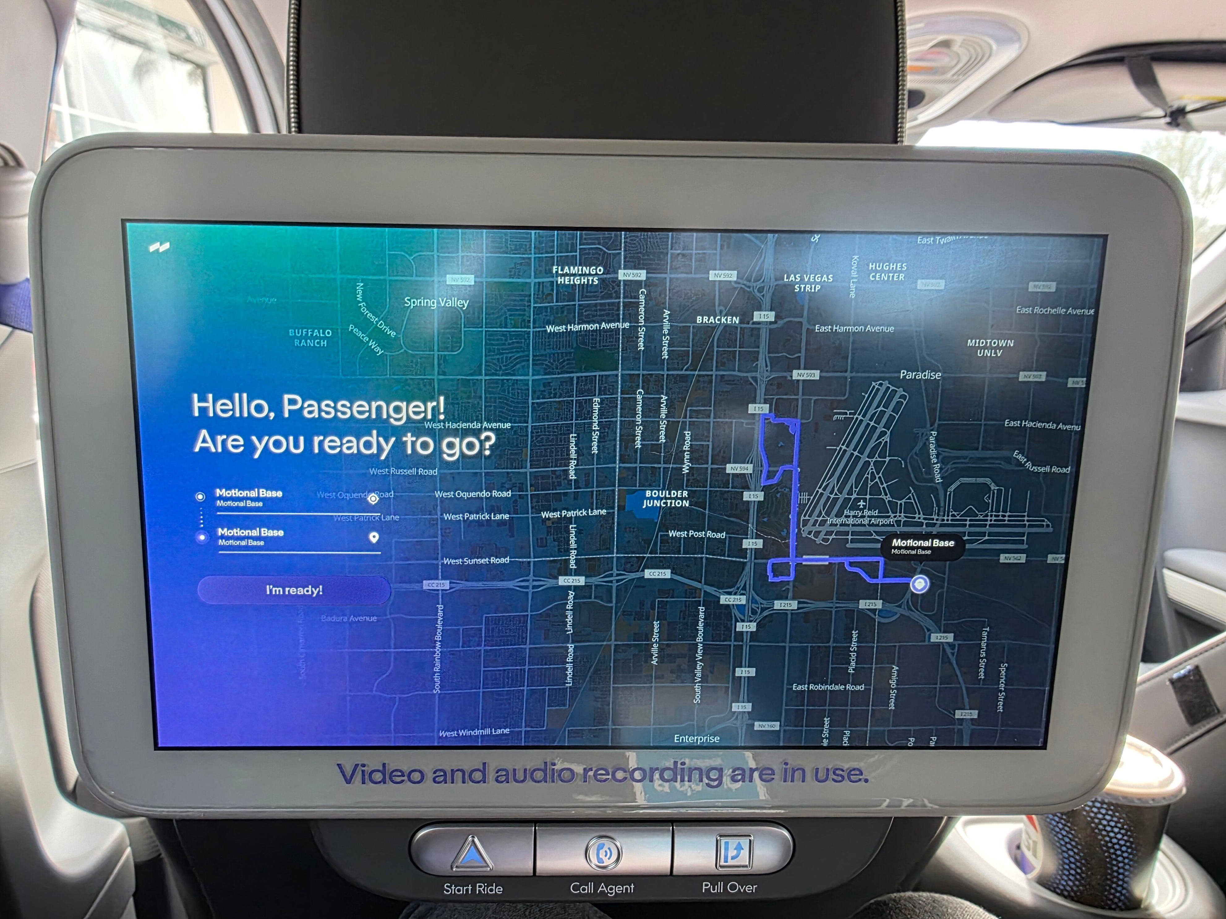 Upon boarding the back seat, each of the two passengers saw the day’s autonomous driving route displayed on screens in front of them. The round-trip course, approximately 40 minutes long, started from the Motional Technical Center, passed Townsquare, a large plaza-style shopping mall, entered the Las Vegas Strip, and returned after stopping at the Mandalay Bay Resort and Casino’s main gate.