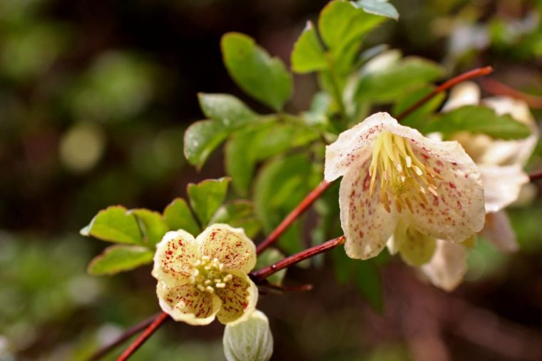 One such plant is Clematis cirrhosa var. purpurascens “Freckles”, which produces small, pale yellow bell-shaped flowers dotted with red. These blooms appear from autumn through early spring, accompanied by evergreen, fernlike foliage. This variety can grow up to 3.5 meters tall, but regular pruning after flowering helps maintain its shape. However, this practice may reduce the number of silky seedheads that appear in summer. It is hardy and thrives in most garden soils, provided it receives full sun or light shade.